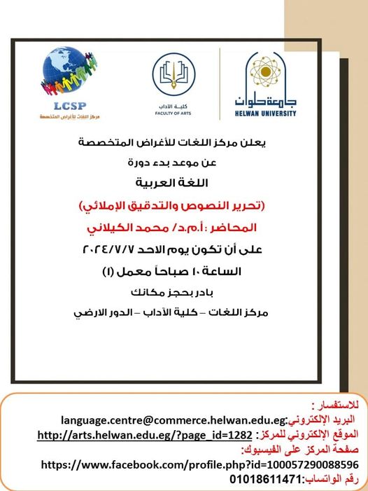 #مركز_اللغات بآداب حلوان يعلن عن دورة جديدة فى تحرير النصوص والتدقيق الإملائي