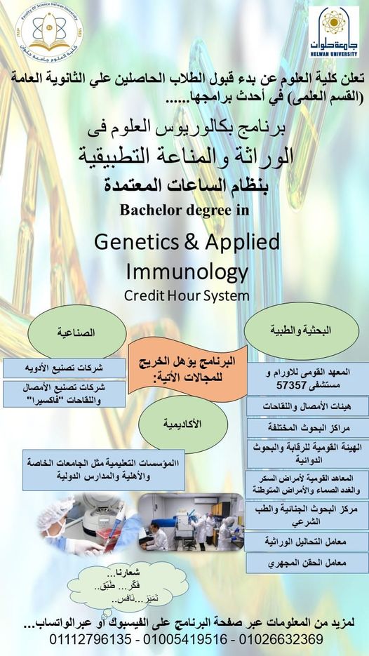 #تنسيق_الجامعات لطلاب الثانوية العامة .. تعرف على #برنامج_الوراثة_والمناعة_التطبيقية بكلية العلوم #جامعة_حلوان يعد برنامج الوراثة والمناعة التطبيقية بكلية العلوم جامعة حلوان هو برنامج خاص بمصروفات بنظام الساعات المعتمدة ، وعدد الساعات المطلوبة للتخرج هو