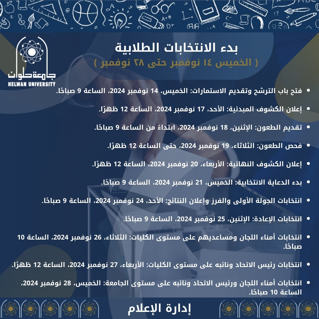جامعة حلوان تفتح باب الترشح للانتخابات الطلابية الخميس المقبل